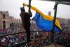 Новорічної ялинки у столиці, схоже, не буде. На її каркасі учасники мітингу розвісили прапори і плакати. А зелені пластикові гілки і елементи огорожі разом з гірляндами розтягнули на барикади.