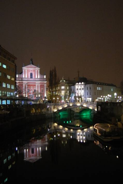 Аж ось настає сьома вечора. Із вимкненим годинником, як на київське око – дванадцята, не менше. На вулицях не стає перехожих, майже всі магазини закриті, офіціанти заносять стільці всередину кафе, що також починають потроху закриватися. Окремі зграйки студентів, чути, ще сміються то тут, то там, але загалом – місто поринає у сон. Світяться вікна, за якими люди ще проводять час із близькими, а нам, іноземцям, нічого більше не лишається, як в майже повній тиші споглядати химерну ілюмінацію центру Любляни, під стать основному елементові міського декору – скульптурним драконам.