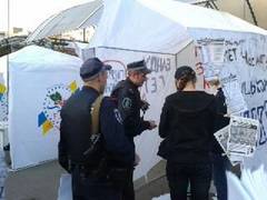 Оскільки нецензурщини правоохоронці на наметі не виявили, було викликано підкріплення з Солом’янського райуправління на чолі з заступником начальника Южеком Анатолієм Степановичем. Міліціонери намагались відібрати в активістів пояснення, фотографують намет, шукають понятих для складання невідомого документу. Підходили також невідомі у цивільному з погрозами.
