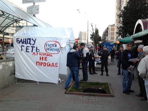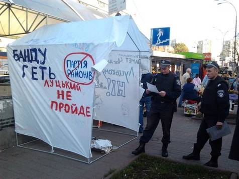 Як інформує сайт "Майдан", спочатку до активістів, які роздавали листівки із закликом не голосувати за Партію регіонів і Максима Луцького підійшло двоє патрульних (головний – Середа Олександр Петрович, командир взводу) з Київського міського управління МВС та повідомили, що до них надійшов виклик від “небайдужого” громадянина про те, що його обурює намет, який “обписаний нецензурщиною”.