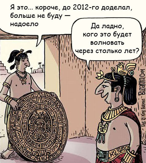 Мабуть, лише лінивий не обговорював теми кінця світу. Ні, не того, про який написано у Святому письмі, а того, який пов’язують із завершенням календаря майя. Ніби все, далі життя не буде. Що з цього приводу тільки не говорили! Здивувало у цій ситуації не тільки факт, що люди повірили, а й те, як власне вони зреагували.