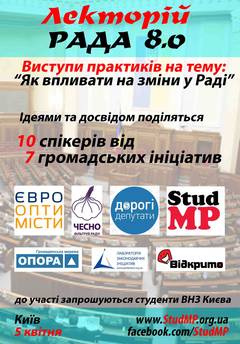 У неділю, 5 квітня, відбудеться Лекторій «Рада 8.0» на тему: «Як впливати на зміни у Раді».