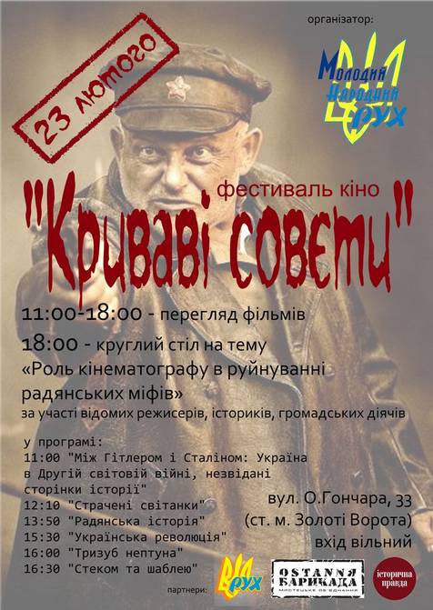 23 лютого у Києві пройде фестиваль кіно «Криваві совєти», метою якого є висвітлення правди про злочини радянської армії та висловлення протесту проти святкування «Дня захисника вітчизни» в Україні.