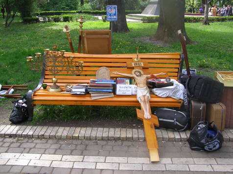 На следующий день ожидали чего угодно, но только не того, что произошло прямо на рассвете. Как рассказывали очевидцы, в четыре часа утра люди в штатском начали разбирать церковные палатки, помнящие еще времена «Оранжевой революции». Священнослужители и набожные старушки отказывались расходиться, после чего в Мариинку вновь приехал «Беркут». Несмотря на молитвы и псалмы самых упорных, верующих силком сгрузили в «автозаки», в то время как другие жители палаточного «Храма» начали ложиться под колеса машин. Но уже за пару часов спецоперация по наведению в парке чистоты была успешно закончена. Пришедшие к 11 часам протестующие испытывали противоречивые чувства. Один дедушка показывая на освобожденную площадку внуку (оба были в вышиванках) радостно заметил: «Смотри, палатку этих коммуняк убрали». Другие справедливо отмечали, что власть таки не имеет двойных стандартов. И если разогнали одних, погнали и вторых. Не смотря даже на то, что «Храм божий», согласно прикрепленной к палатке табличке, являлся собственностью народного депутата от коммунистов Екатерины Самойлик. К 11 часам сотрудники коммунальных служб заканчивали уборку территории. На голую землю были настелены пласты с травой, видимо, из разных партий – новоявленная зеленая лужайка оказалась довольно забавной и была похожа на шахматную доску. Неподалеку на лавочках под охраной милиции была сгружена церковная утварь, а сами верующие устроили молебен у памятника герою Советского союза, красному генералу Ватутину. Вероятно, это была «последняя просьба» хозяйки палатки. Счет – 2:2.