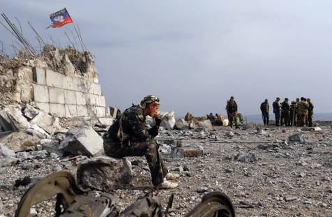 Прорусский сепаратист сидит на своей позиции на Саур-Могиле, холме к востоку от города Донецка, 28 августа 2014 года (Фото: Максим Шеметов/Reuters)