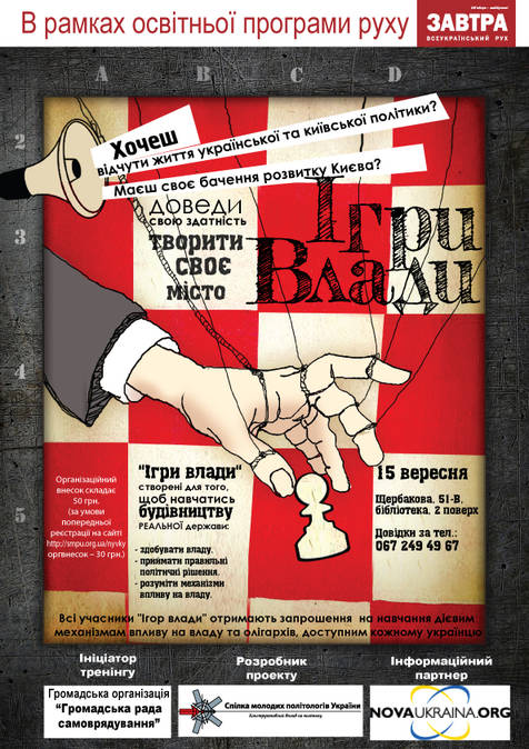 «Ігри влади» – єдина доступна в Україні організаційно-діяльнісна гра, побудована таким чином, щоб дати змогу учасникам побачити всі процеси, які відбуваються всередині держави, з різних точок зору: політика, підприємця, громадського діяча", - каже один з організаторів проекту Артем Стельмашов.