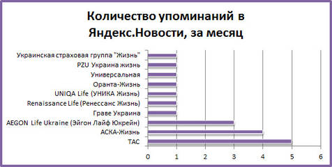 На 19 компаній страхування життя за місяць припало всього... 19 згадок в електронних ЗМІ. Такий показник є не просто низьким, але навіть зовсім неприйнятним для організацій подібного типу. Адже багато українців сьогодні просто не розуміють необхідності страхування життя, тому й не особливо цікавляться таким видом послуг, а тим більше - конкретними компаніями, що надають ці послуги. Компаніям страхування життя, в такому випадку, необхідно пояснювати українцям, навіщо потрібен такий вид страхування. Але своїм піаром в Інтернет-ЗМІ такі компанії наполегливо не займаються: так, кілька згадок різних компаній страхування життя використовуються в одній і тій же статті.