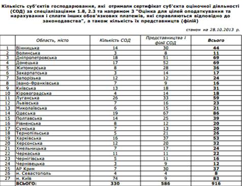 На 25 жовтня 2013 року Фонд державного майна України «допустив» на ринок оцінки майна для цілей оподаткування 319 оціночних господарських структур. З них 240 НІКОЛИ до цього не здійснювали оціночну діяльність. Попри те, що раніше у Фонді держмайна України запевняли про «повну готовність» до впровадження нової системи оцінювання для цілей оподаткування, виявилось протилежне. ФДМУ фактично не виконав покладених на нього обов’язків та допустив численні порушення.