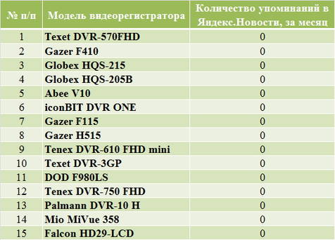 — Кількість згадок за той же період про модель відеореєстратора в Інтернет-ЗМІ та електронних інформаційних агентствах , розраховане за допомогою агрегатора Яндекс.Новини.