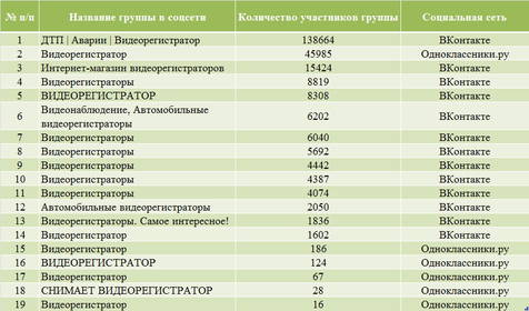Найбільш численною виявилася група ВКонтакте, присвячена відеореєстраторів, ДТП і аварій (майже 140 тисяч учасників групи), найбільш популярною в соцмережі Одноклассники.ру виявилася група "Відеореєстратор", чисельністю більше 45-ти тисяч людей. Так, на веб-ресурсі vk.com відкриті понад 1,5 тисячі спільнот про відеореєстратори, а на порталі odnoklassniki.ru - більше двох десятків.