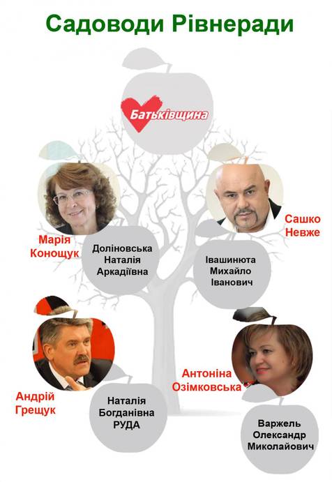 «Батьківщина»: Не проти посадити яблуні і груші й люди пов’язані з опозиційними депутатами. Заяву на клаптик під садочок написала й дочка керівника міської організації ВО «Батьківщина» Марії Конощук – Доліновська Наталія Аркадіївна. У документах вона значиться директором ТОВ «Регістр-Інфо» та співзасновницею одного з благодійних фондів. Так багато клопотів у жінки, а залишаються ще сили і бажання поратись біля дерев.