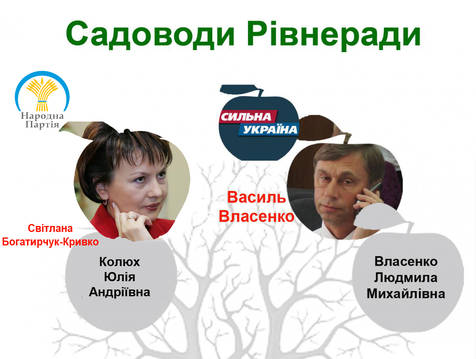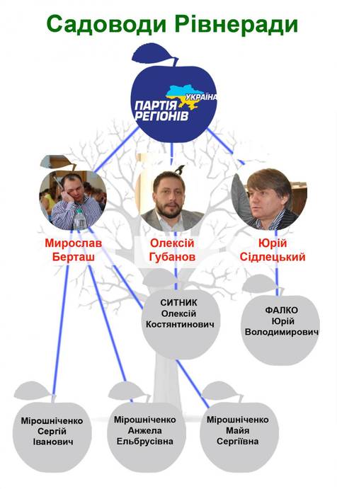 Партія регіонів: Мірошніченко Анжела Ельбрусівна, має давні і дружні стосунки з депутатом Рівненської міської ради Мирославом Берташем. Хоча, точніше буде сказати, що її родина має давні і дружні стосунки з родиною Берташів. Пані Анжела, дочка Ельбруса Абдулаєва, першого заступника голови Рівненської облдержадміністрації часів керівництва областю Миколи Сороки. У списку потенційних майбутніх садоводів значиться також її чоловік Мірошніченко Сергій Іванович та дочка Мірошніченко Майя Сергіївна. Яка, до речі, вчиться у столиці на журналіста.