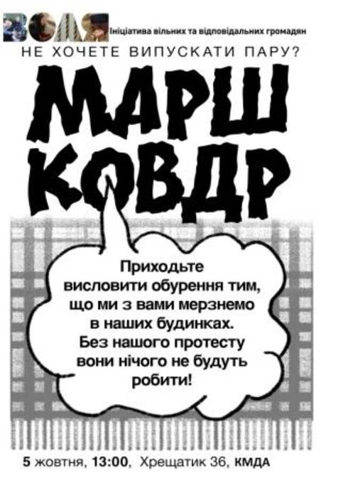 «Досить мерзнути вдома, приходьте вимагати тепла, за яке абсолютна більшість киян вчасно заплатила. Без голосу вулиці, на жаль, ця влада нічого не чує і не робить. Навіть такі обов’язкові речі, як своєчасне завершення ремонтів теплотрас та спрямування наших комунальних платежів на оплату роботи ТЕЦ», - каже Олексій Герман, активіст ініціативи «Воля», яка скликає Марш.