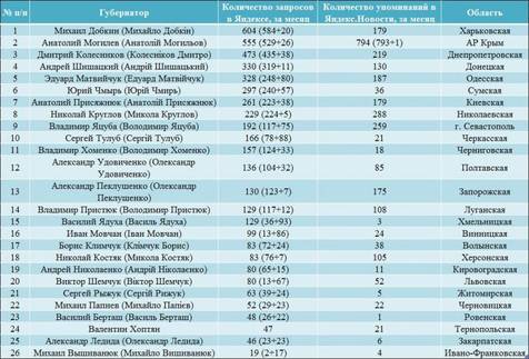 Аналізуючи дані про кількість згадувань у ЗМІ та популярності губернаторів, можна помітити, що існує певний зв'язок. Так, Анатолій Могильов, про якого найчастіше писали в електронних виданнях, опинився на другій сходинці рейтингу популярності українських губернаторів; про Михайла Добкіна, що займає лідируючу позицію в рейтингу журналу для інвесторів "Україна сьогодні: finanso.net", також досить часто згадували новинні веб -портали (179 згадувань у Яндекс.Новини за місяць); про Дмитра Колесникова, що знаходиться на третьому місці в рейтингу популярності голів обладміністрацій України, також не забували ЗМІ - 219 згадувань у Яндекс.Новини за місяць.