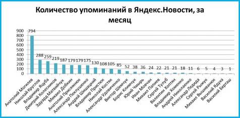 — Кількість згадок за місяць про губернатора в електронних ЗМІ та інформаційних агентствах, розраховане за допомогою агрегатора Яндекс.Новини.