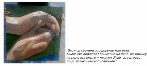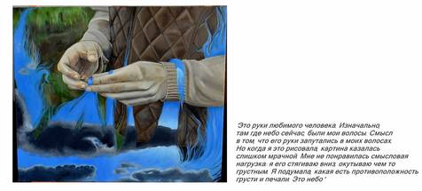 - Это, наверное, так банально... Мне кажется, нет прекрасней ничего, нет... есть конечно вещи важнее, но очень важно понять в жизни, чего ты хочешь. Я хочу заниматься этим, я хочу этим зарабатывать. Мне нравится моя работа, у меня замечательная работа, но я хочу рисовать, я знаю. Я не хочу быть культурологом или юристом, я хочу продавать картины. Мне хотелось бы в ближайшем будущем что-то с этим делать. Но понятно, что в силу какого-то внутреннего ступора, я очень боюсь что-то делать. Когда ты сравниваешь себя с теми людьми, которые в игры играют, тебе кажется, что ты никому не нужен. Когда ты сравниваешь себя с теми, кто выигрывает, ты понимаешь, что кто-то может солгать, слицимерить и выставить что-то под твоим искусством. А я слишком искренная в этом, мне страшно. Я очень хочу это страх преодолеть.
