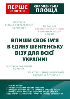 Учасники флешмобу розгорнуть на сходах Українського дому велику шенгенську візу, «оформлену» на Україну.