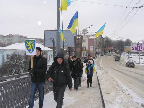 За кілька хвилин підійшла колона ЗУНР у складі півтора-двох десятків молоді. Цікаво, що ані в колоні УНР, ані в колоні ЗУНР не було видно нікого з місцевих опозиційних чи провладних політиків. Хіба окрім екс-кандидата в нардепи Олексія Хахльова, який приєднався до колони УНР. Та депутата міськради Анатолія Чугуєвця, котрий під`їхав, постояв кілька хвилин, не виходячи з авто і поїхав геть ще до початку руху обох “Україн” назустріч одна одній.