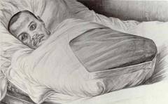 Рисунок: «Неизвестный солдат». Никто ничего не знает о жизни этого человека. В результате тяжелейшего ранения он потерял руки и ноги, лишился речи и слуха. Война оставила ему только возможность видеть. Рисунок сделан на острове Валаам, куда советская власть после войны принудительно сослала всех калек. Все рисунки 1974 года...