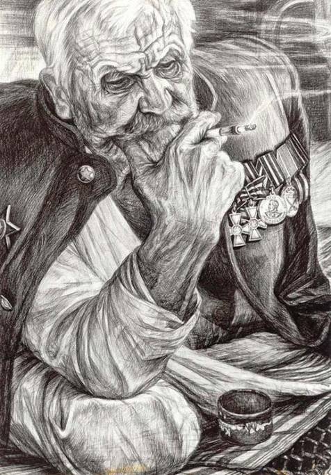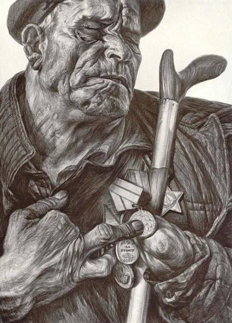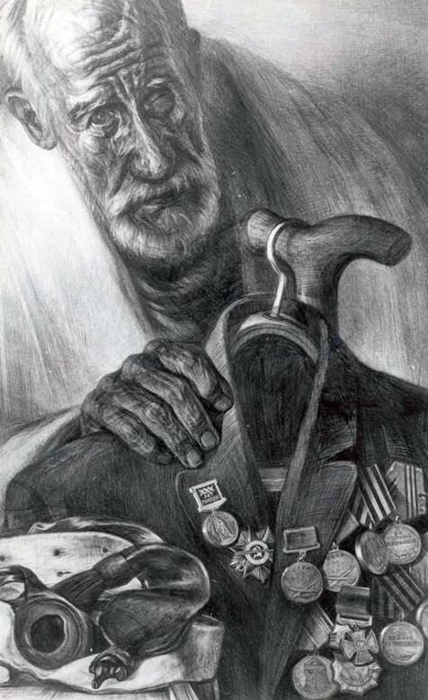 «Старый воин». Ратник трех войн: русско-японской (1904-1905 гг.), Первой мировой (1914-1918 гг.), Второй мировой (1939-1945 гг.) Когда художник рисовал Михаила Казанкова, тому исполнилось 90 лет. Кавалер двух Георгиевских крестов за Первую мировую войну, воин закончил свою геройскую жизнь на острове Валаам. НЕЛЬЗЯ носить Георгиевский крест рядом с железкой, на которой изображен ПАЛАЧ твоего народа. Судьба этого не простит.