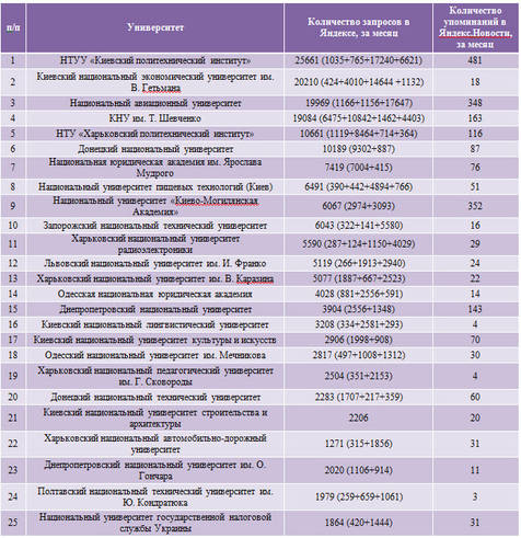 З метою показати інвесторам і роботодавцям, які ВНЗ сьогодні є найбільш популярними, які надають найбільш якісні освітні послуги, а про які - найбільш часто повідомляють інформаційні портали та Інтернет-ЗМІ, розбиралися аналітики розділу "Новини України" інтернет порталу Україна сьогодні: finanso.net у статті "PR рейтинг ВНЗ України: Яндекс і ВКонтакте підказали, що шукають абітурієнти".
