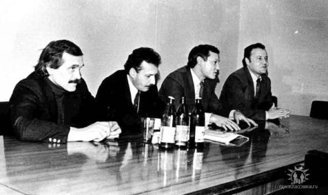 На фото: Прес-конференція в РАТАУ (нині Укрінформ), присвячена першому робочому польоту Ан-124 "Руслан", січень 1986. Перший зліва Володимир Репік...