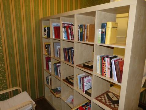 Адміністратор проводить мене ще в одну кімнатку. Це Читальня. Кілька крісел, чимало книжок – і класичних, і сучасних. Тут за бажанням відвідувачів можна вимкнути музику і залишитися в повній тиші сам на сам з книжкою.