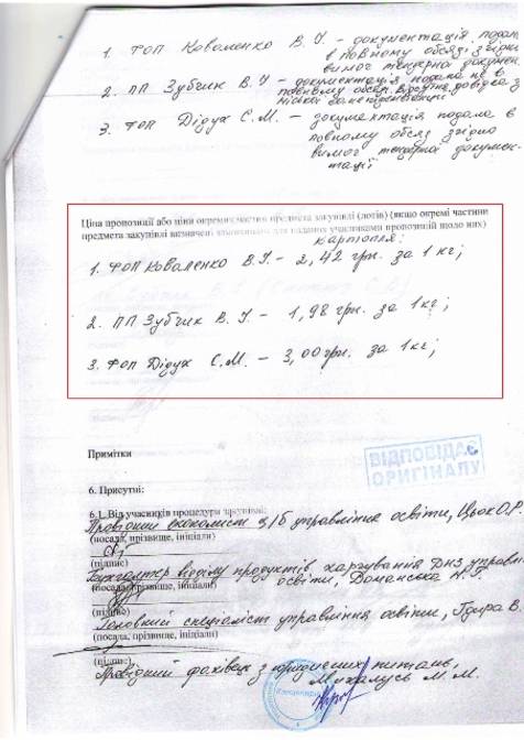 Причини, які начальник Луцького управління освіти навів у коментарі, справді зазначено в протоколі № 3 засідання тендерного комітету із закупівлі картоплі для ДНЗ Луцька від 14 вересня 2011 р.: «Під час розгляду та перевірки комплекту документів учасників торгів було виявлено наступне: ПП Зубчик В. І., відповідно до вимог тендерної документації, не надала довідки міської санітарно-епідеміологічної станції; не підтверджено факт укладання цим підприємцем договору на закупівлю картоплі з фермерським господарством „АКО“; терміни, вказані в умовах розрахунків, — 145 днів, не відповідають дійсності, оскільки до кінця цього року залишилося менше днів, а торги на закупівлю картоплі проводять на 2011 бюджетний рік. Пропозицію відхилено.