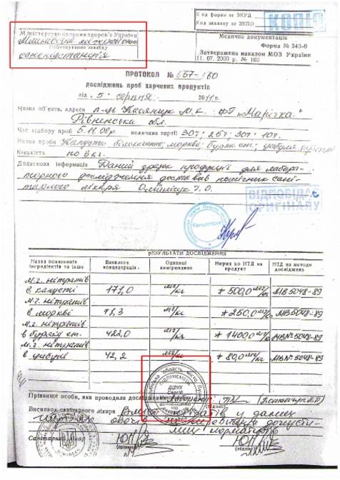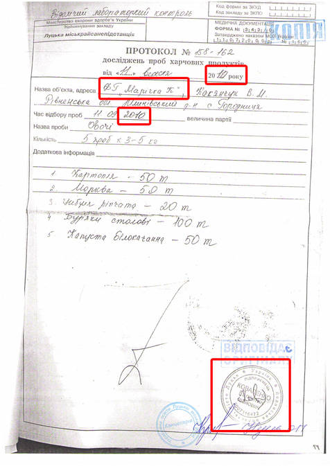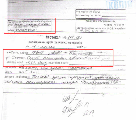 Очевидно, таким документом мав би бути протокол досліджень проб харчових продуктів, проведених Луцькою міськрайсанепідемстанцією. Проте його видали 11 вересня… 2010 р.! Більше того — навіть на ксерокопії видно, що цифру «10» у році ставили поверх коректора, отже це міг бути й більш давній протокол.