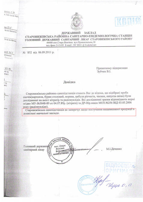 Згідно із вивченими документами, ПП Зубчик В. І. мала відповідну довідку, яку 6 вересня 2011 р. підписав головний державний санітарний лікар Старовижівської районної санепідемстанції Дяченко М. І. Він не був проти постачання овочів, зокрема й картоплі, в дошкільні навчальні заклади.
