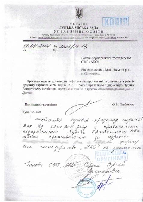 Управління освіти Луцької міської ради 14 вересня 2011 р. надсилає голові фермерського господарства «АКО» листа з проханням надати інформацію про те, чи укладав він договір купівлі-продажу картоплі з приватним підприємцем Валентиною Іванівною Зубчик. Вочевидь, що того самого дня голова СФГ дає негативну відповідь, бо того ж таки 14 вересня 2011 р. тендерний комітет встигає провести засідання й ухвалити рішення, про яке ми згадували вище.