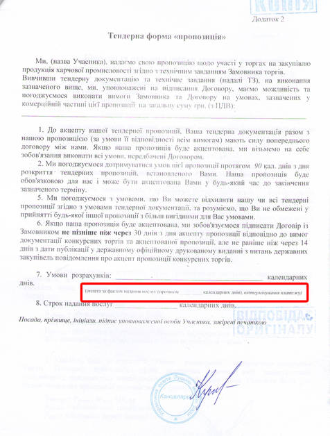 Чиста словесна еквілібристика. Адже в Додатку 2 до тендерної документації, який називається «Тендерна форма „Пропозиція“», чорним по білому в умовах розрахунку написано: «оплата за фактом надання послуг (протягом __________ календарних днів), відтермінування платежу».