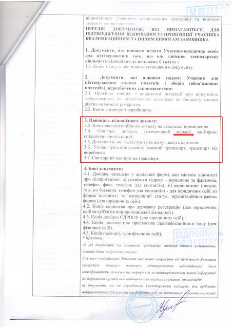 У тендерній документації на закупівлю 211 т картоплі, затвердженій рішенням тендерного комітету від 4 серпня 2011 р., серед переліку документів, необхідних для підтвердження відповідності пропозиції учасника кваліфікаційним та іншим вимогам замовника, є й оригінал довідки, рекомендації міської санітарно-епідеміологічної станції та документи, що засвідчують безпеку та якість картоплі.