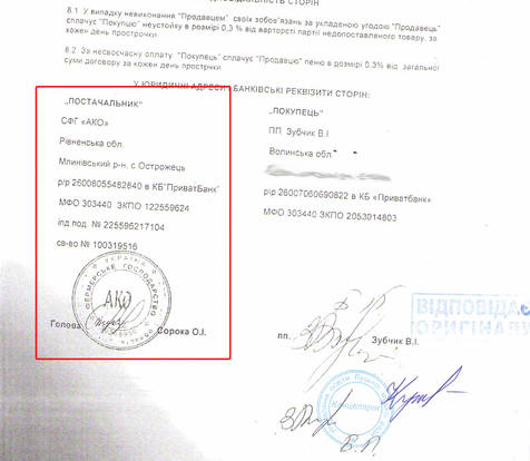 Уважно прочитавши документи, ми з’ясували, що договір купівлі-продажу № 28 ПП Зубчик В. І. уклала із СФГ «АКО» 6 липня 2011 р. За цим договором вона зобов’язувалася придбати 300 т продовольчої картоплі. Від СФГ «АКО» підпис із печаткою поставив(ла?) Сорока О. І. (зверніть увагу на ініціали!).