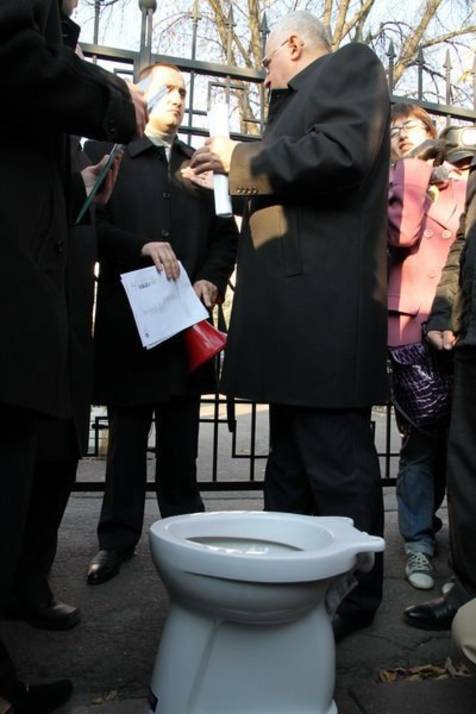 Учасники акції подарували для міністра освіти Д.ТАБАЧНИКА унітаз і мішки туалетного паперу, які принесли з собою.