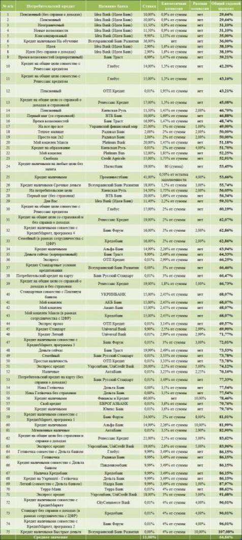 Найбільш вигідни пропозиції сьогодні має "Idea Bank": цей банк пропонує кілька видів кредитів готівкою, при яких ефективна ставка досить низька, а разова комісія - відсутня. До таких пропозицій можна віднести кредити "Пенсійний (без довідки про доходи)" (ставка - 10 відсотків, щомісячна комісія - 0,9 відсотка від суми, ефективна ставка - 29,64 відсотка), "Необмежений" (ставка - 11,5 відсотка, щомісячна комісія - 0,9 відсотка від суми, ефективна ставка - 31,1 відсотка), "Нові можливості "(ставка - 11,5 відсотка, щомісячна комісія - 0,9 відсотка від суми, ефективна ставка - 31,1 відсотка)," Консолідований "(ставка - 9,9 відсотка, щомісячна комісія - 1,15 відсотка від суми, ефективна ставка - 35 відсотків).