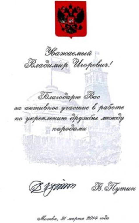 В списке под № 1 на вручение президентской «Почетной грамоты» — фамилия ведущего церемонии награждения, депутата Госдумы от «Единой России» и председателя РСВА Франца Клинцевича, третьим в списке идет его сын Андрей, который возглавляет ювелирную компанию Shantal, курирует военно-патриотические программы «Молодой Гвардии «Единой России» и частенько выступает по гостелеканалам экспертом по ситуации в Украине.