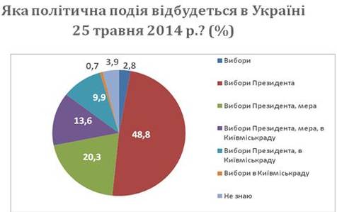 Результати соціологічного опитування, яке було проведено студентами факультету «Соціології, психології та соціальних комунікацій» Національного педагогічного університету ім. М.Драгоманова і Фондом «Освітні ініціативи» в Києві 4-9 квітня 2014 року, показали, що лише 13,6% опитуваних знають про те, що 25 травня відбудуться вибори президента, мера і в Київміськраду. Із 676 чоловік, серед яких студенти і працюючі, віком 18-29 років, тільки 62% ствердно відповіли про готовність йти на вибори. 9,8% взагалі не планують приймати участь у голосуванні.