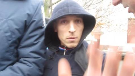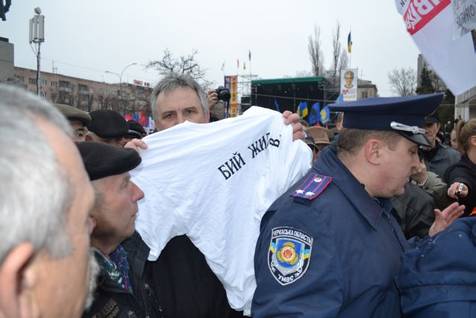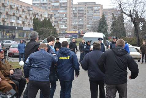«Свободівці» Михайло Вакуленко та Юрій Сиротюк (нардеп) разом з іншими опозиціонерами передали хлопця в руки міліціонерів. При цьому невідомий чоловік (на фото нижче) всіляко перешкоджав цьому та намагався завадити журналістам фіксувати його на відео, показуючи якесь посвідчення та вимагаючи видати йому провокатора.