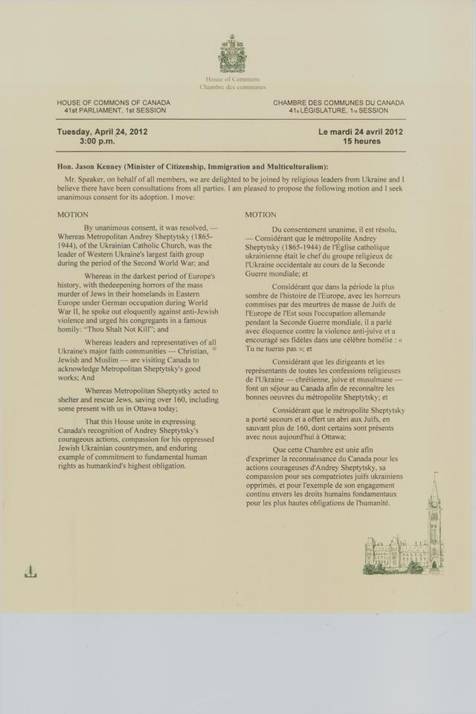 Як відомо, Джейсон Кенні був ініціатором розгляду у квітні 2012 р. Палатою общин Канадського Парламенту резолюції, що вшановувала діяльність митрополита Шептицького як людини, яка в роки ІІ Світової війни, ризикуючи власним життям, рятувала життя своїх співвітчизників - українських євреїв. Резолюцію було прийнято одноголосно.