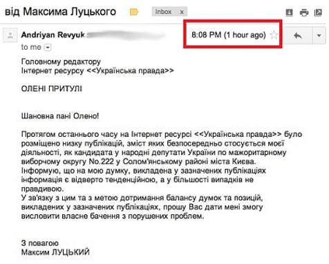 При цьому лише саме в цей час на адресу редакції "Української правди" надійшов його лист з приводу статті в УП.
