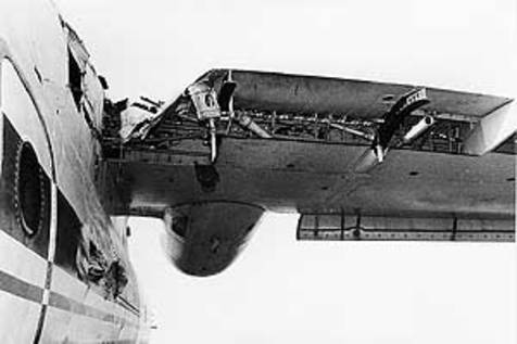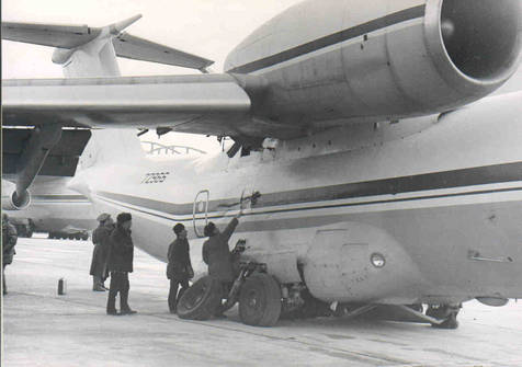 Специалисты осматривают повреждения самолета Ан-72 после его аварийной посадки на аэродром «Гостомель» 10 февраля 1995 года. Фото АНТК им. Антонова