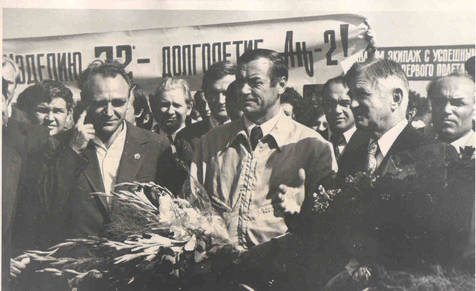 Владимир Терский принимает поздравления от Олега Антонова после первого полета Ан-72. Слева будущий преемник Генерального конструктора Петр Балабуев. 1977 год