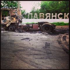 Ощутимо расшатывает нервную систему и визуальная картинка войны: комбинированные баррикады и сложенные из железобетонных изделий блок-посты, украшенные табличками "Мины" и увенчанные флагами РФ и ДНР; столбы черного дыма, возникающие в разных частях города; воронки на газонах и в асфальте; следы попаданий артснарядов в частные и многоквартирные дома. Многие строения стоят без стекол, выбитых осколками или вылетевших от детонации. Местами зияющие проемы уже затянуты пленкой, завешены покрывалами, забиты фанерой. Почти на всех сохранившихся стеклах наклеен крест-накрест скотч, - взрывную волну он, конечно, не остановит, но уменьшит разлет стекольных осколков. Кстати, скотч в Славянске стал за последний месяц одним из самых дефицитных товаров.