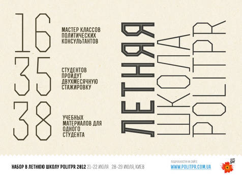 Подобно тому как работают летние школы в Гарварде и Лондонской школе экономики, организаторы летней школы PolitPR составили новую образовательную программу. Новая программа составлена при содействии Попечительного совета Школы, в сотрудничестве с Канадской и Европейской ассоциацией политических консультантов, при поддержке Украинской ассоциации политтехнологов.
