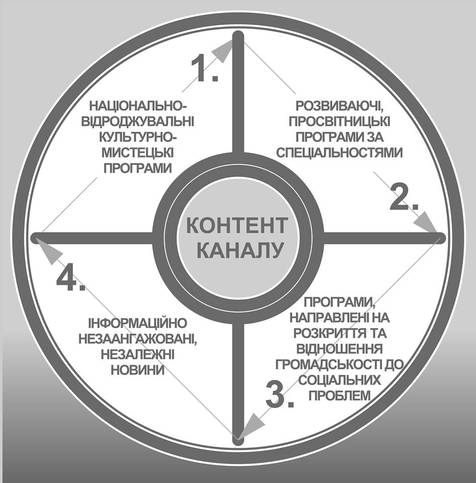 Серед основних критеріїв, що мають переважати у КГМ є цікавий контент, оскільки сьогодні в телемовленні бракує саме соціально-відповідальних, соціально-корисних та розвиваючих програм. Філософія нового каналу має бути заснована на трьох нерозривно поєднаних постулатах: незалежне та неупереджене подання матеріалу; підняття, відновлення цінностей та традицій українського народу; висвітлення матеріалу, направленого на розвиток громади.