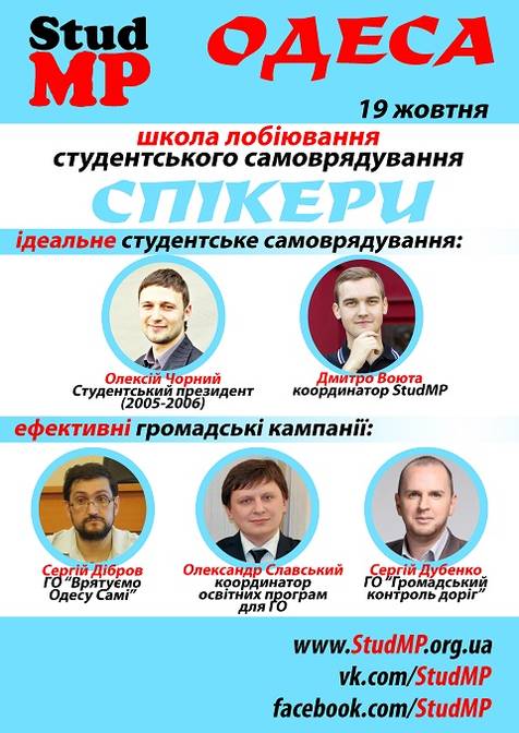 Отже, 19 жовтня в Одесі пройде сесія другого набору проекту StudMP. Ми запросили місцевих спікерів, які розкажуть, як змінювати систему студентського самоврядування на більш ефективну і вже у студентські роки впливати на владу.