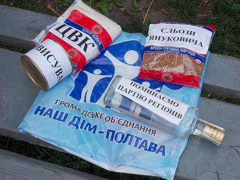 Запакована передачка у фірмовий пакет громадського об’єднання «Наш дім – Полтава». Саме в таких пакунках лідер ГО й нинішній міський голова Олександр Мамай, котрий прийшов до влади під символікою «Совісті України», а зараз перейшов на бік «біло-блакитних», уже неодноразово роздавав продуктові набори жителям Полтави пенсійного віку, маніпулюючи симпатіями електорату. Тепер, за словами Сергія Капліна, прийшов час повернути знахабнілим чиновникам їхню подачку, показати, що українці не продаватимуть свої голоси на виборах.