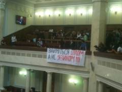 У Верховній Раді на ложі преси вивішено плакат «Займіться ділом, а не язиком».