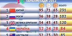 На першій сходинці команда Китаю (95, 71, 65), на другій - Росія (36, 38, 28), третє місце у британців (34, 43, 43).